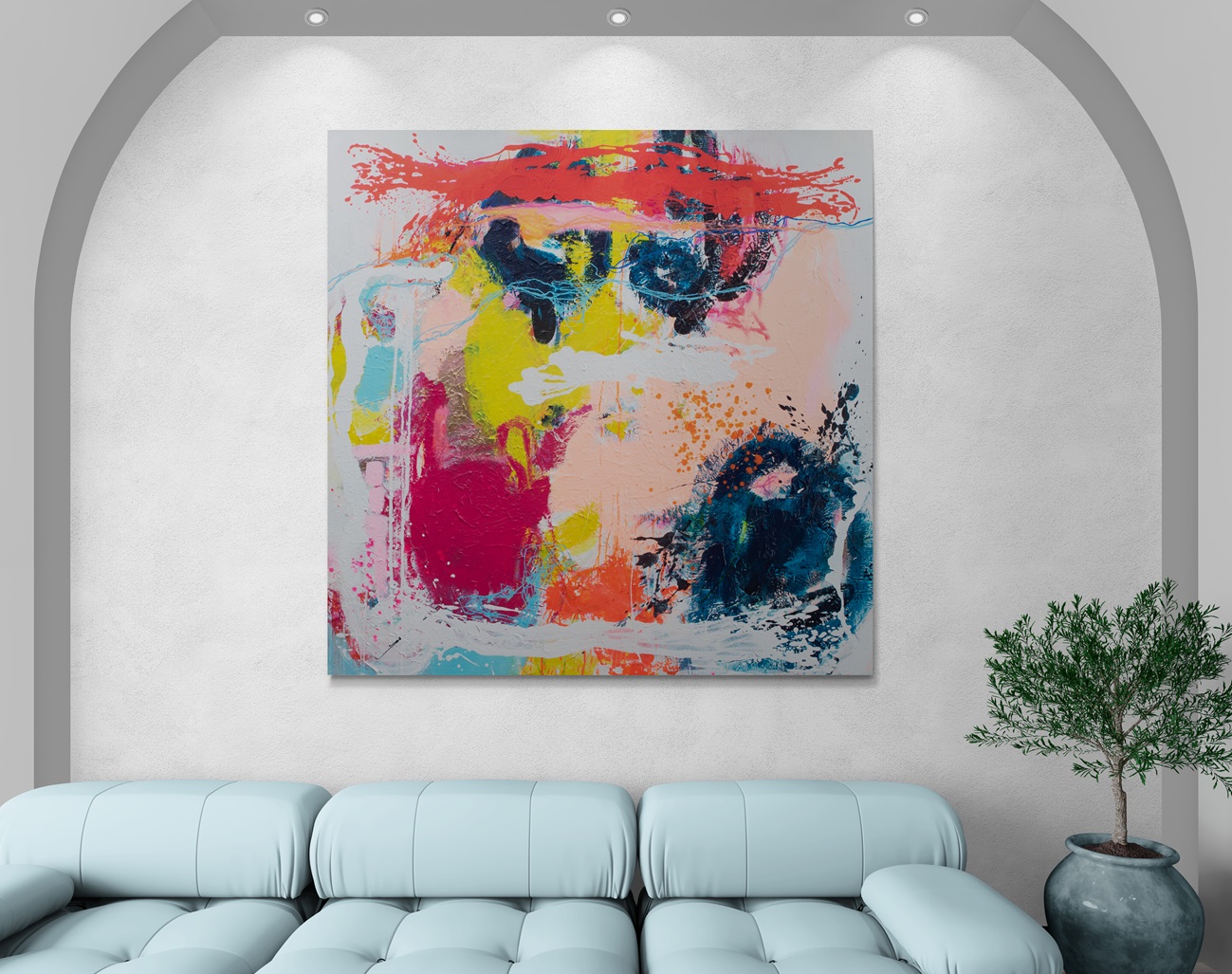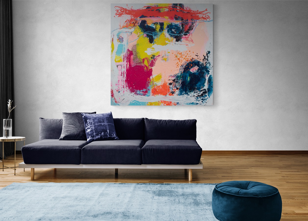 Explore this textured 150 x 150 cm artwork with a 3cm depth, and appreciate the blend of acrylic paint, mixed media, and a textured canvas.